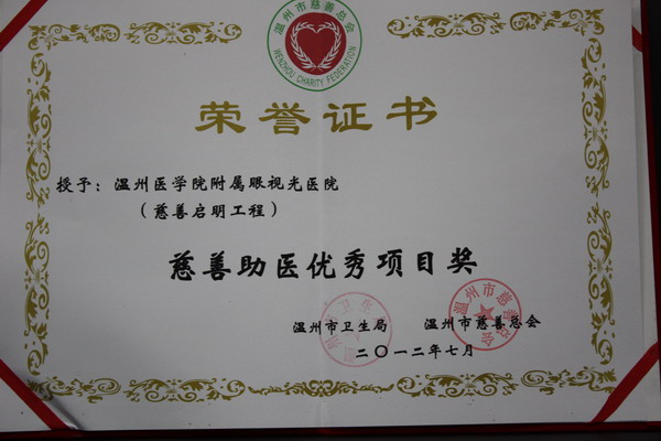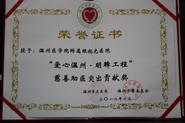 “愛心溫州·善行天下·明眸工程”自2009年12月起,分別在貴州、云南、青海、四川、重慶、河南、陜西、新疆等8省(區(qū)、市)11家醫(yī)院舉行啟動(dòng)儀式,上個(gè)月18號(hào)及20號(hào),明眸工程的安徽行啟動(dòng)儀式以及中國(guó)僑聯(lián)的健康光明行活動(dòng)分別在安徽蚌埠市及湖北荊州舉行,以負(fù)責(zé)幫助合作醫(yī)院培養(yǎng)眼科專業(yè)人才,開展貧困白內(nèi)障、角膜移植等復(fù)明手術(shù)項(xiàng)目,旨在幫助我國(guó)更多貧困眼疾病患者重見光明。經(jīng)過三年的努力,也獲得了很多的榮譽(yù)和褒獎(jiǎng)。